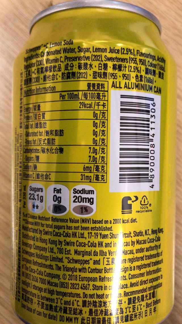 Ingredients: Carbonated Water, Sugar, Lemon Juice(2.5%), Flavourings, Acidity Regulator [330], Vitamin C, Preservative {202}, Sweeteners (955, 950), Colour (160a).