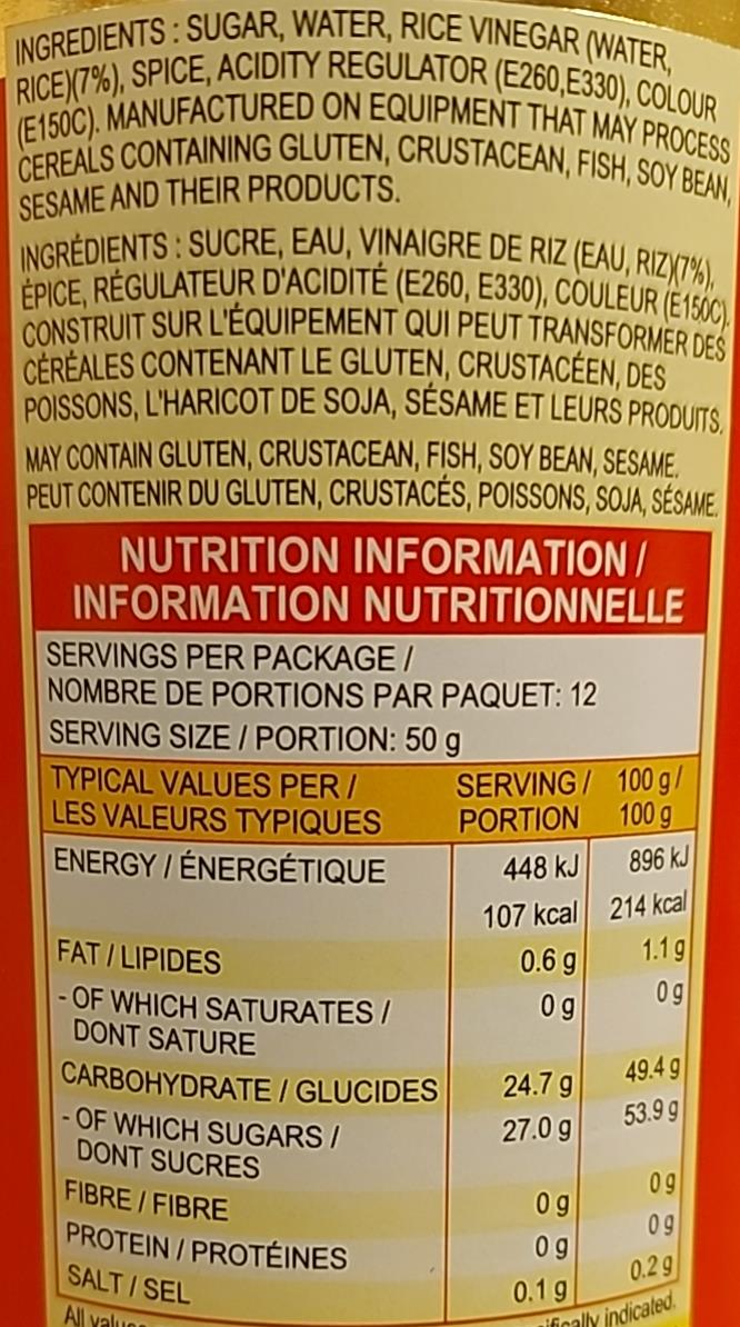 Ingredients: Sugar, Water, Rice Vinegar (Water, Rice) (7%), Spice, Acidity Regulator (E260, E330), Colour (E150C). Manufactured On Equipment that may process cereals containing gluten,crustacean,fish,soy bean, sesame and their products.