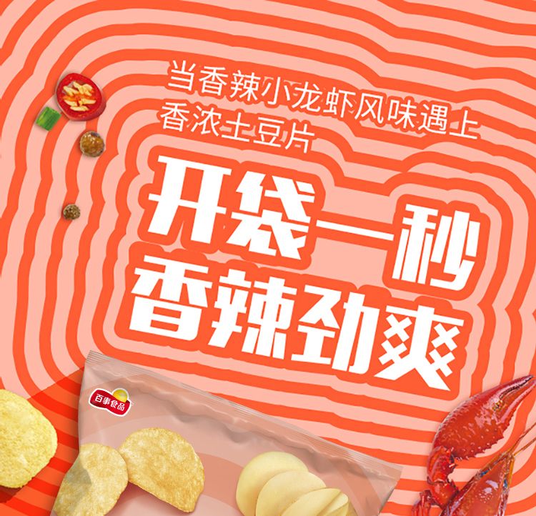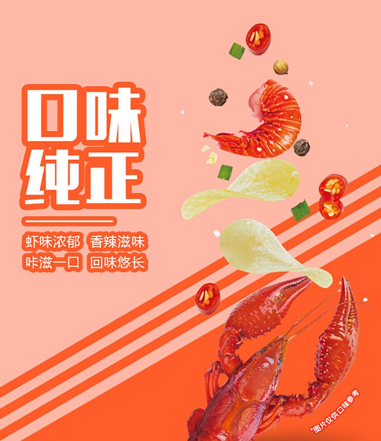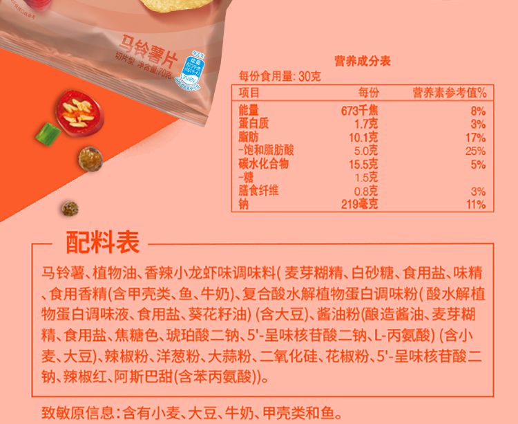 Ingredients: Potato Flour, Vegetable Oil, Spicy Lobster Flavour Seasoning (E965, Sugar, Salt, Hyfrolysed Vegetable Protein Powder (Hydrolysed Vegetable Protein, Salt, Sunflower Oil, Soybean)), Soy Sacuce Powder (Soy Sauce, E965, Salt, E150a, E635), Wheat, Soybean, Chilli Powder, Onion Powder, Garlic Powder, Garlic Powder, E228, Sichuan Pepper Powder, E635, E160a, E851