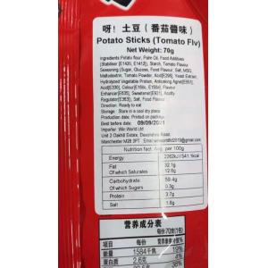 Ingredients: Potato flour, Palm Oil, Food Additives (Stabiliser [E1420, E1412]), Starch, Tomato Flavour Seasoning (Sugar, Glucose, Food Flavour, Salt, MSG, Mattodextrin, Tomato Powder, Acid[E296J, Yeast Extract, Hydrolyzed Vegetable Protein, Anticaking Agnet[E551], Acid[E330], Colour[E160c, E150a], Flavour Enhancer[E635], Sweetener[E921], Acidity Regulator[E363]), Salt, Food Flavour.