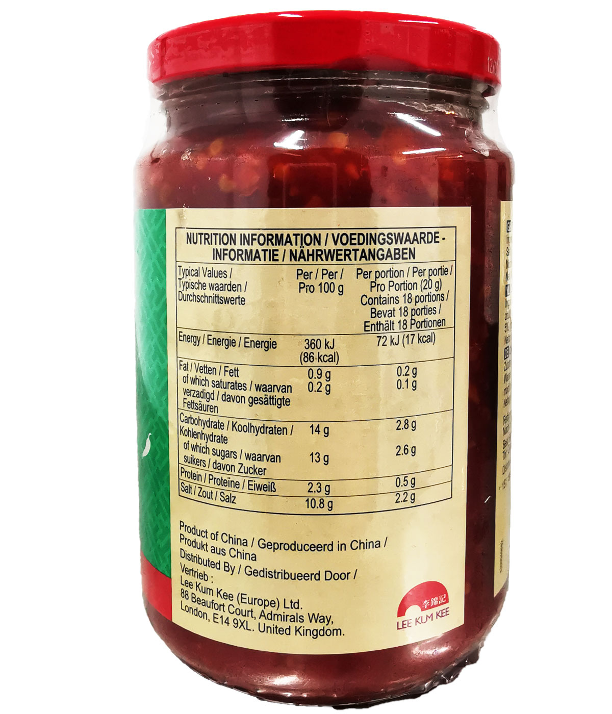 Ingredients: Salted Chilli Peppers 59% (Chilii Peppers, Salt), Water, Sugar, Rice Vinegar, Dehydrated Garlic 5%, Modified Corn Starch, Acid E260
