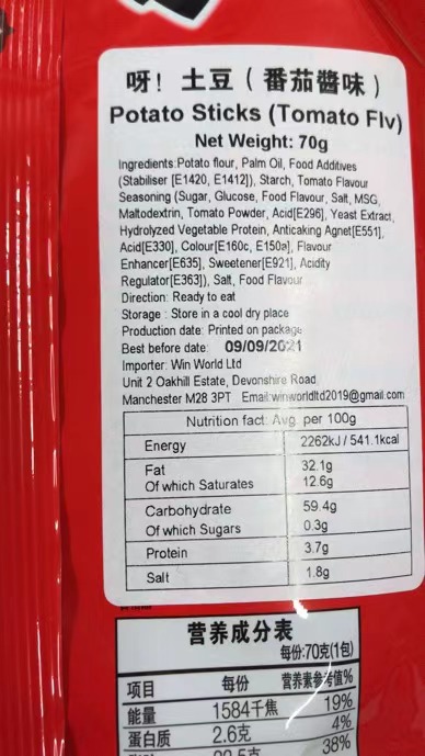 Ingredients: Potato flour, Palm Oil, Food Additives (Stabiliser [E1420, E1412]), Starch, Tomato Flavour Seasoning (Sugar, Glucose, Food Flavour, Salt, MSG, Mattodextrin, Tomato Powder, Acid[E296J, Yeast Extract, Hydrolyzed Vegetable Protein, Anticaking Agnet[E551], Acid[E330], Colour[E160c, E150a], Flavour Enhancer[E635], Sweetener[E921], Acidity Regulator[E363]), Salt, Food Flavour.