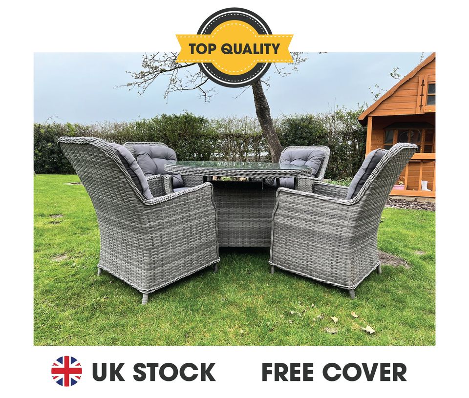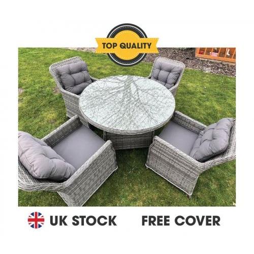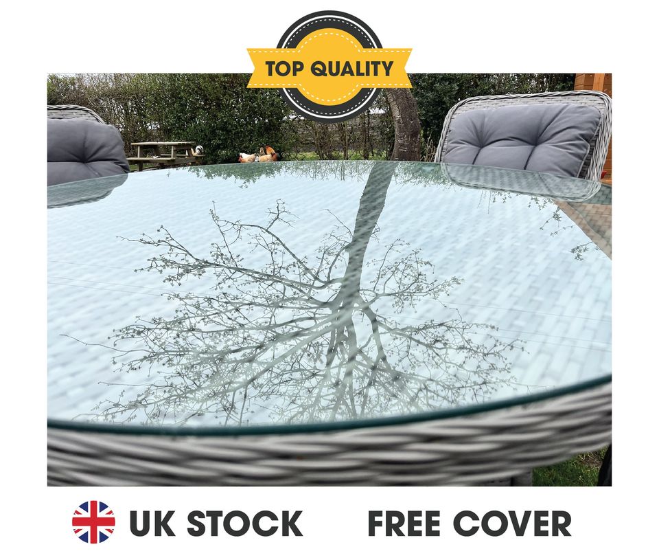 送货费额外加收£50.00. 铝管:1*餐桌Φ120*74cm(不含火盘及配件),桌面无伞孔 4*餐椅64*64*94cm,5cm厚座垫,22D海棉,上下各2cm喷胶棉。280克灰色面料,靠背垫同小图做法,9*1.2mm抗UV2000小时藤条,8mm厚钢化清玻 两张椅子一箱:820*630*1070,