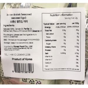 Ingredients: Seaweed 54%, Canola Oil, Perilla oil, Refined Salt, Flavour Enhancer (E621), Sesame Oil